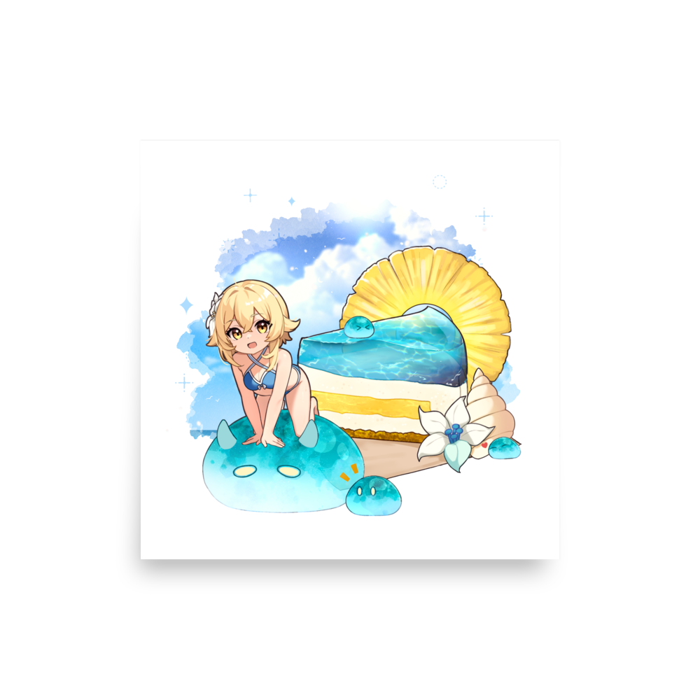 This art print brings together hydro slimes, a dreamy ocean jelly topped cheesecake with a pineapple filling and sweet summer vibes for a tropical Genshin delight.🌴