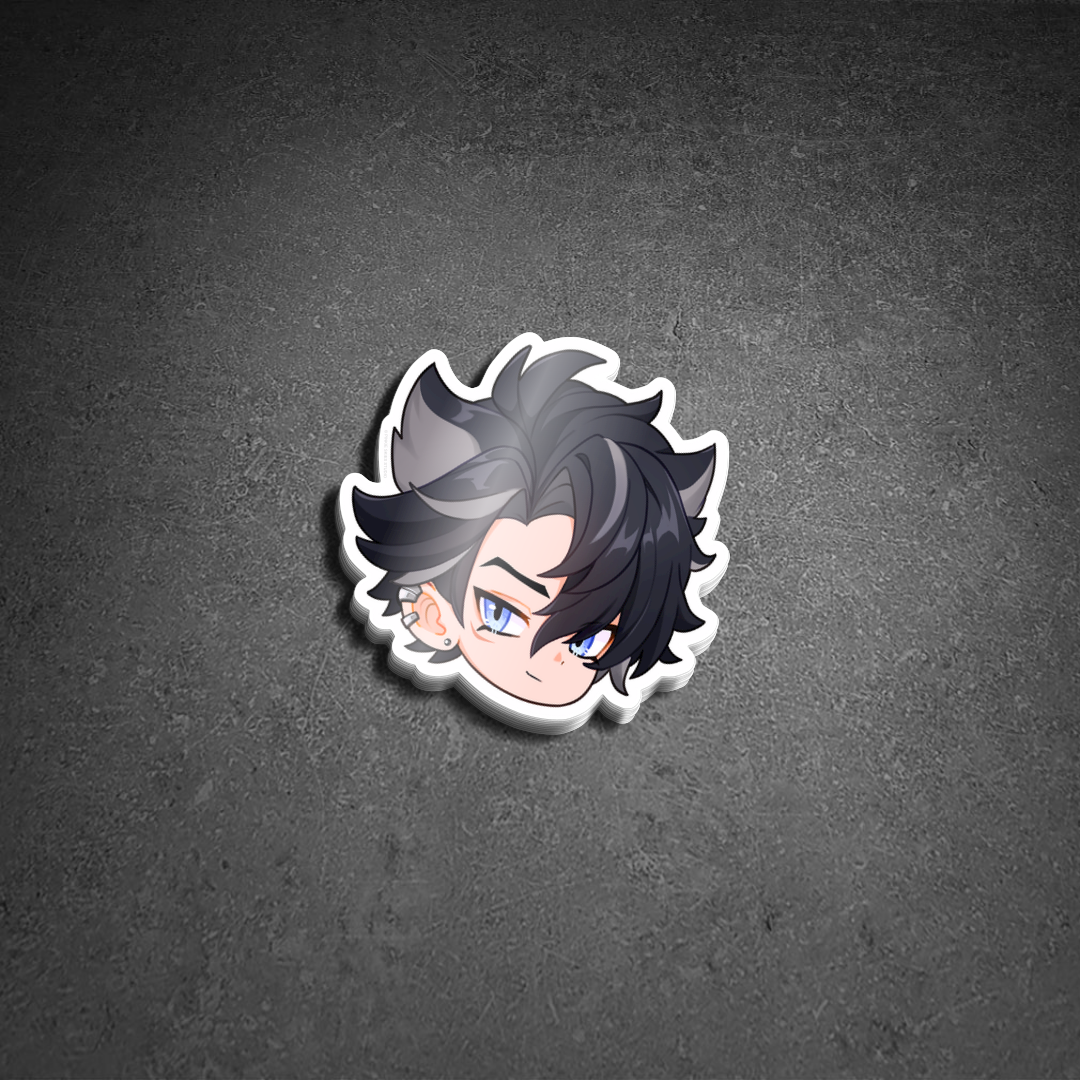 A sticker depicting a chibi-style character, Wriothesley, with black hair and blue eyes, with their signature ear piercings.